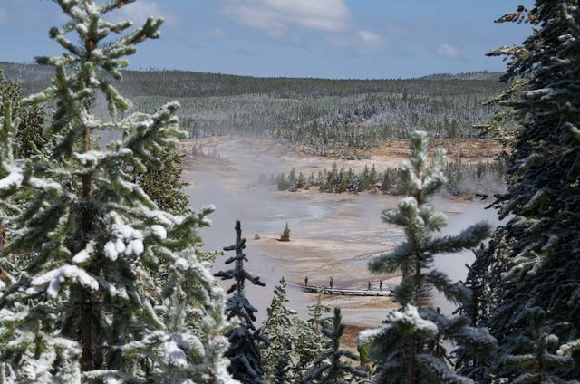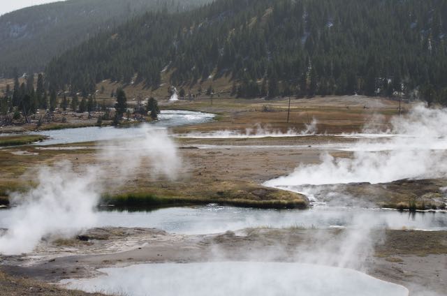We got up early and over to Indian Creek Campground in time to reserve a spot. Then we were off to Norris Geyser Basin but saw this fellow on the way. C’s pretty proud of that shot.